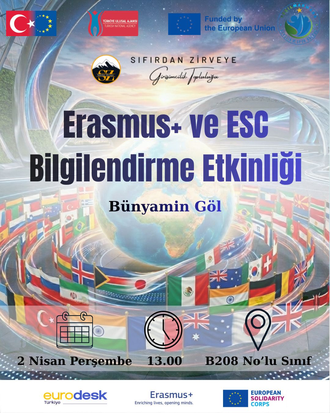 Fakültemiz öğrenci topluluklarından Sıfırdan Zirveye Kulübü tarafından düzenlenen Erasmus+ ve Avrupa Dayanışma Programı (ESC) Bilgilendirme Etkinliği gerçekleştirilecektir.