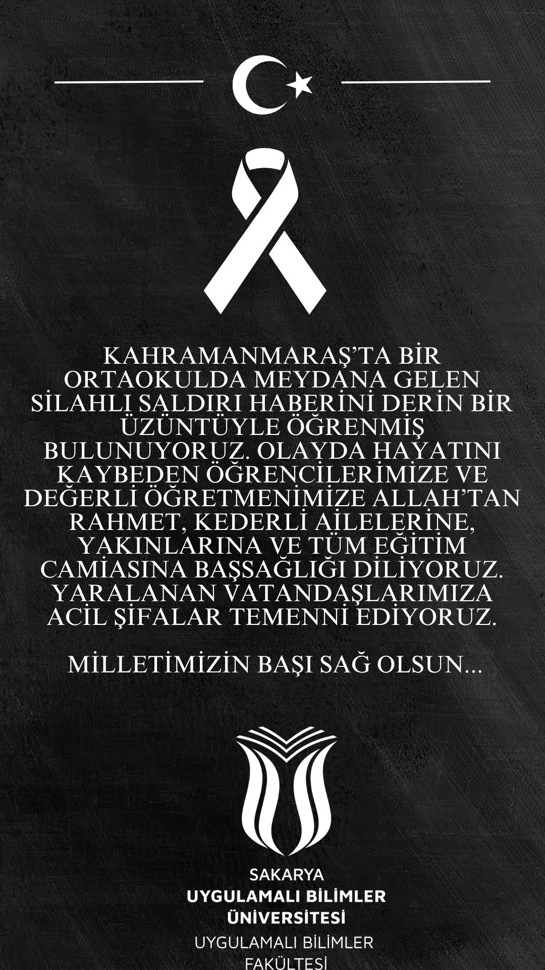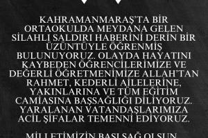 Kahramanmaraş’ta bir ortaokulda meydana gelen silahlı saldırı haberini derin bir üzüntüyle öğrenmiş bulunuyoruz. Olayda hayatını kaybeden öğrencilerimize ve değerli öğretmenimize Allah’tan rahmet, kederli ailelerine, yakınlarına ve tüm eğitim camiasına başsağlığı diliyoruz. Yaralanan vatandaşlarımıza acil şifalar temenni ediyoruz.