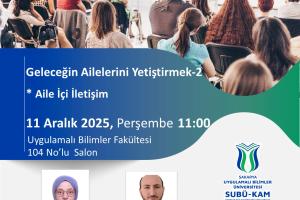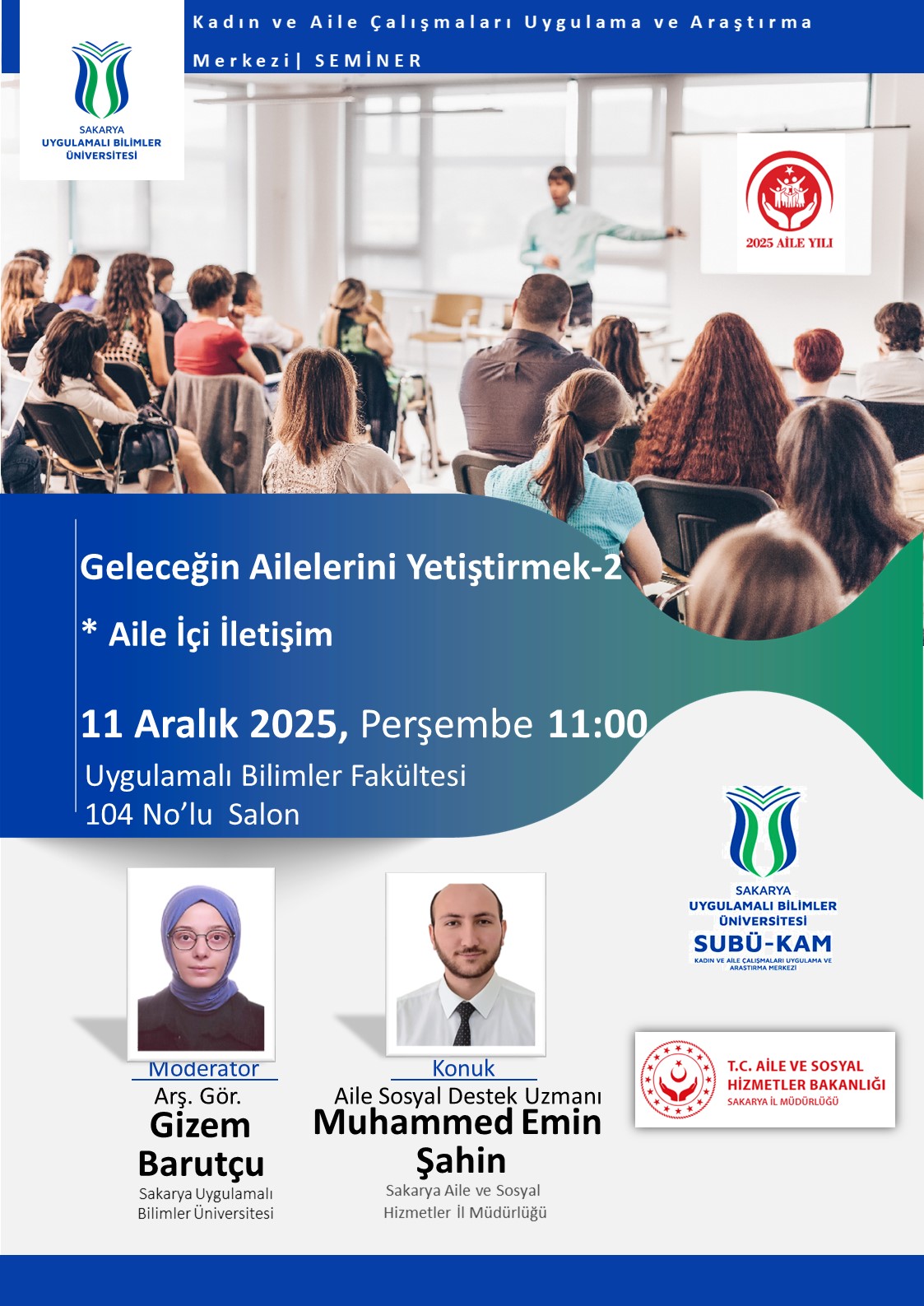 SUBÜKAM ve Sakarya Aile ve Sosyal Hizmetler İl Müdürlüğü iş birliği ile Uygulamalı Bilimler Fakültesi öğrencilerimiz için 2025 Aile Yılı kapsamında “Geleceğin Ailelerini Yetiştirmek-2” temalı eğitim programı olarak “Aile İçi İletişim” konulu seminer düzenlenecektir.